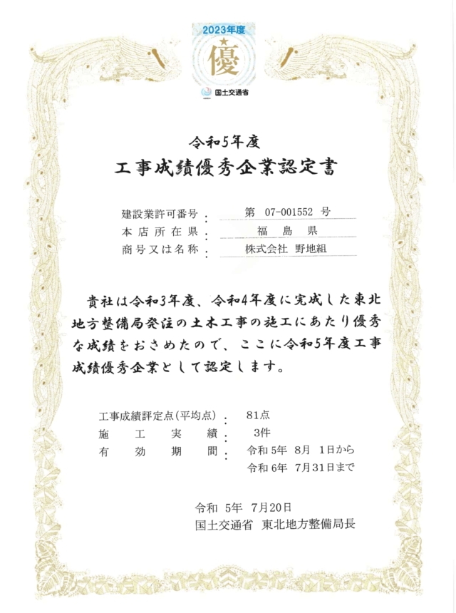 国土交通省東北地方整備局より令和5年度工事成績優秀企業認定されました。